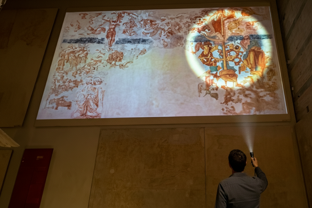 Per il Museo delle Sinopie di Pisa, TuoMuseo s.r.l. ha realizzato un’esperienza di Digital Restoration che trasforma la visita in un gesto attivo di scoperta. Attraverso una torcia interattiva, il pubblico può puntare la luce sulla sinopia (il disegno preparatorio) e vedere comparire in sovrapposizione, in tempo reale, la ricostruzione dell’affresco definitivo oggi esposto al Camposanto Monumentale: un “overlay” dinamico che colma le lacune della sinopia, restituendo dettagli, cromie e parti mancanti.